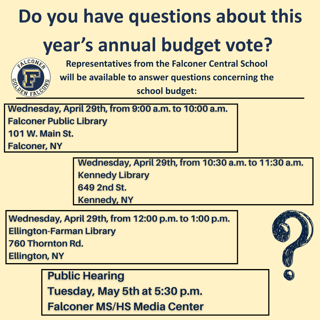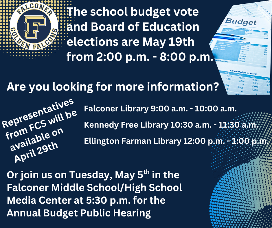 Don't forget to vote! This year's budget vote will be held on Tuesday, May 19th, from 2:00 p.m. to 8:00 p.m. in the MS/HS gymnasium foyer.